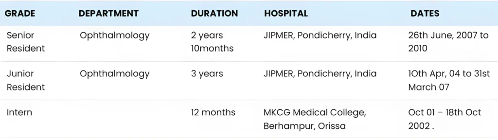 As a senior resident , I have gained experience and performed corneal procedures like penetrating keratoplasty, PK with secondary scleral fixation of PCIOL. I taught the junior residents the steps of cataract surgery( SICS, PHACO) and managed their complications like PCR, Zonular dialysis. I have gained experience in putting foldable IOL also. Apart from it laser photocoagulation, laser capsulotomy, trabeculectomy taught to final years residents. I am capabale of managing ocular emergencies and trauma. I am well versed with following procedures.