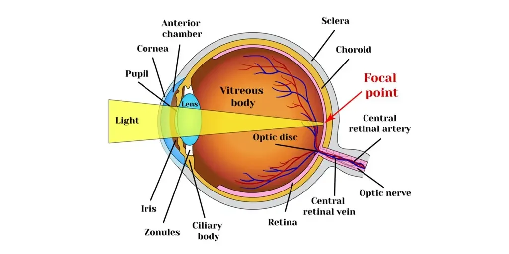Hyperopia (Farsightedness): Difficulty seeing close objects clearly because light focuses behind the retina.